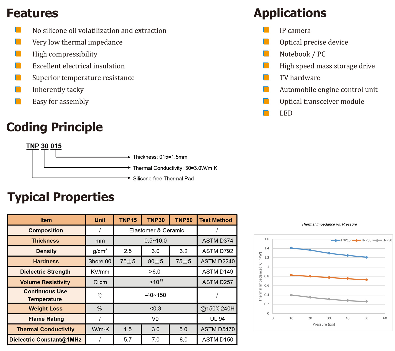 TM TNP系列是具有超高導熱性的無硅導熱墊,為填充硅油敏感電子元件和散熱器之間的氣隙提供了熱解決方案。它具有高壓縮性、粘性表面、柔軟性和靈活性。此款導熱墊可以防止硅油對電子元件的污染。" />