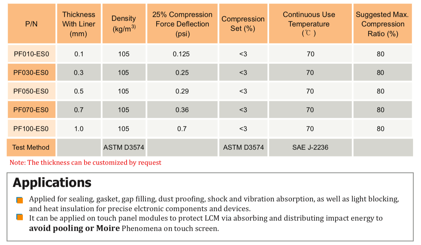 TM PF-ES0 系列是一種非常柔軟、低密度且緩慢回彈的PU泡棉,用于電子設備應用中的防塵、防液、隔光和隔音密封。它具有極佳的可壓縮性和順應性。ES0系列具有非常低的壓縮永久變形率,還具有高密封性能,出色的沖擊吸收能力,非常適合用作LCD/TP防影(摩爾紋)解決方案以及揚聲器墊圈、相機鏡頭密封、連接器緩沖墊、電池墊等。" />